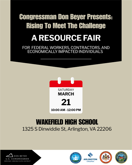 The latest event in this series is a Resource Fair for Federal Workers, Contractors, and Economically Impacted Individuals on Saturday, March 21 at 10:00am at Wakefield High School, which I am hosting in partnership with the City of Alexandria, the City of Falls Church, Arlington County and Fairfax County. As many of our Northern Virginia neighbors navigate economic uncertainty, this resource fair will allow individuals to connect directly with trusted local partners who can help them access the support they need – from housing assistance and food banks to workforce and small business resources.